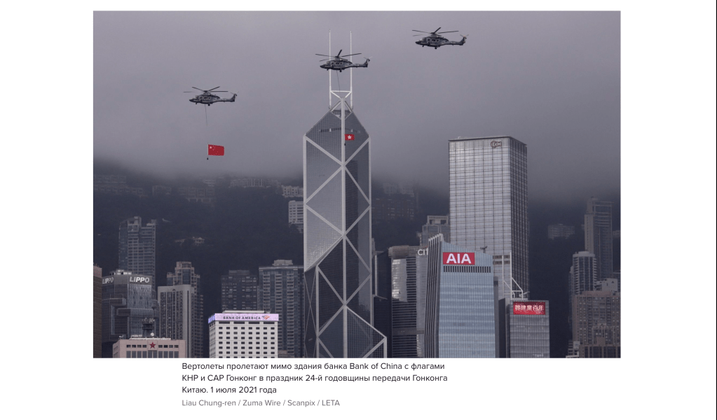 A Helicopters fly past BANK OF CHINA TOWER ( centre ) displaying PRC national flag and HKSAR official flag on the celebration of 24th anniversary of Hong Kong’s Handover to China and centenary of Chinese Communist Party.