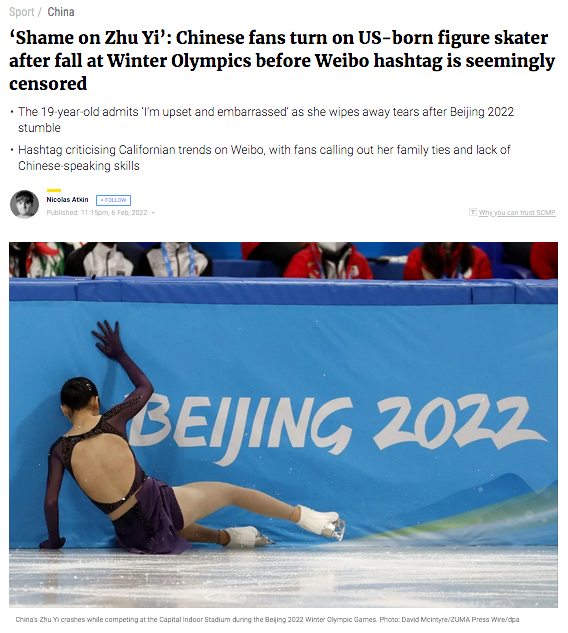 February 6, 2022, Beijing, China: ZHU YI (CHN) falls during the women’s single skating short program during the Beijing 2022 Olympic Winter Games at Capital Indoor Stadium. The 19-year-old is facing a firestorm on Chinese social media after she fell flat on the ice and finished last in the women’s short program team event. On Weibo, China’s Twitter-like platform, the hashtag ”Zhu Yi has fallen” gained 200 million views in just a few hours. Many questioned why Zhu, an American-born skater, was picked to represent China at the expense of an athlete born in the country. ”This is such a disgrace,” said a comment with 11,000 upvotes. (Credit Image: © David G. McIntyre/ZUMA Press Wire)