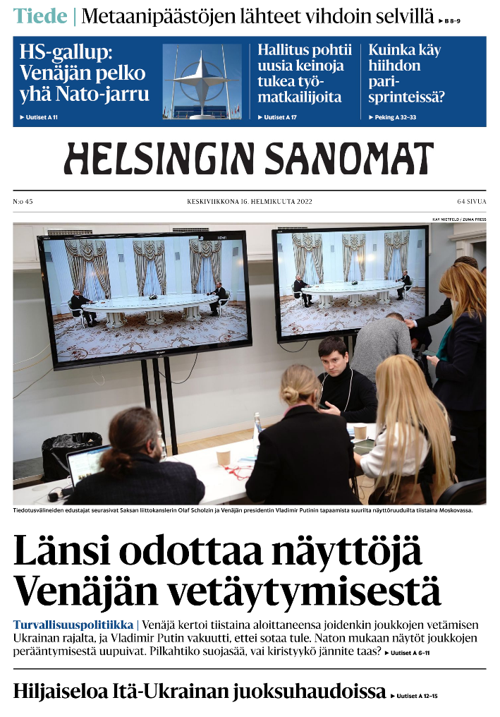Lead Image: 15 February 2022, Russia, Moskau: Journalists in a press room follow the broadcast of the meeting between German Chancellor Olaf Scholz (SPD, screen right) and Russian President Vladimir Putin. Scholz met the Russian president for talks on the situation on the Ukrainian-Russian border. Formally, this is an inaugural visit by the chancellor. (Credit Image: © Kay Nietfeld/dpa/ZUMA Press)