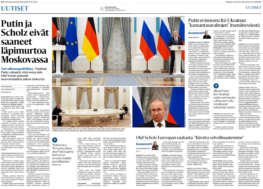 Second Page, Bottom Right: 15 February 2022, Russia, Moskau: Russian President Vladimir Putin looks on at a joint press conference with German Chancellor O. Scholz (SPD) after several hours of one-on-one talks in the Kremlin. Scholz met the Russian president for talks on the situation on the Ukrainian-Russian border. Formally, it is an inaugural visit of the Chancellor. (Credit Image: © Kay Nietfeld/dpa via ZUMA Press)