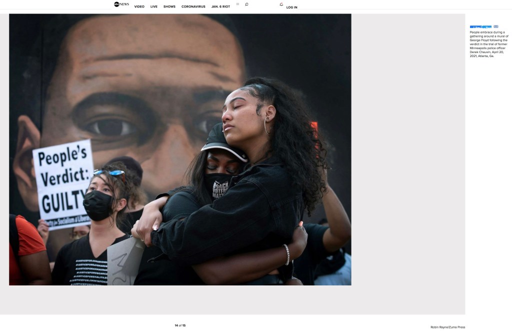 April 20, 2021, Atlanta, Georgia, USA: Two young woman embrace as emotions were high, following guilty verdicts coming down on former Minneapolis police officer Chauvin Tuesday. Crowds gathered for a peaceful gathering in downtown Atlanta, in front of mural of his victim, George Floyd. Sign in background saying PEOPLE’S VERDICT GUILTY.