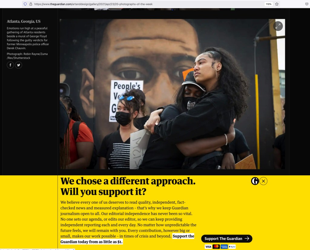 April 20, 2021, Atlanta, Georgia, USA: Two young woman embrace as emotions were high, following guilty verdicts coming down on former Minneapolis police officer Chauvin Tuesday. Crowds gathered for a peaceful gathering in downtown Atlanta, in front of mural of his victim, George Floyd. Sign in background saying PEOPLE’S VERDICT GUILTY.