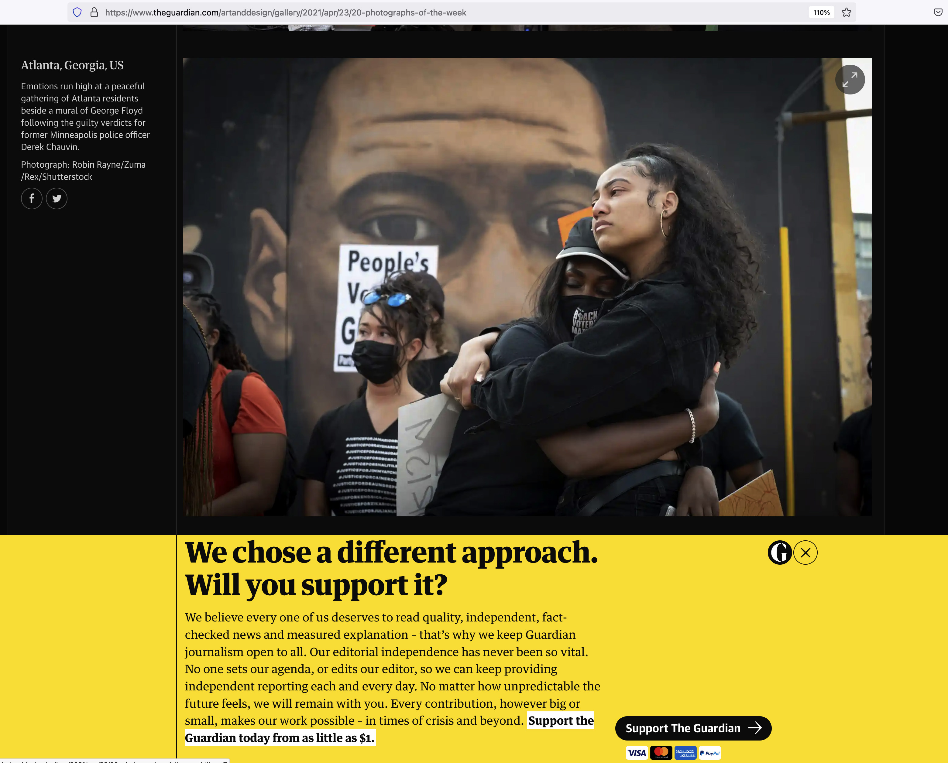 April 20, 2021, Atlanta, Georgia, USA: Two young woman embrace as emotions were high, following guilty verdicts coming down on former Minneapolis police officer Chauvin Tuesday. Crowds gathered for a peaceful gathering in downtown Atlanta, in front of mural of his victim, George Floyd. Sign in background saying PEOPLE’S VERDICT GUILTY.