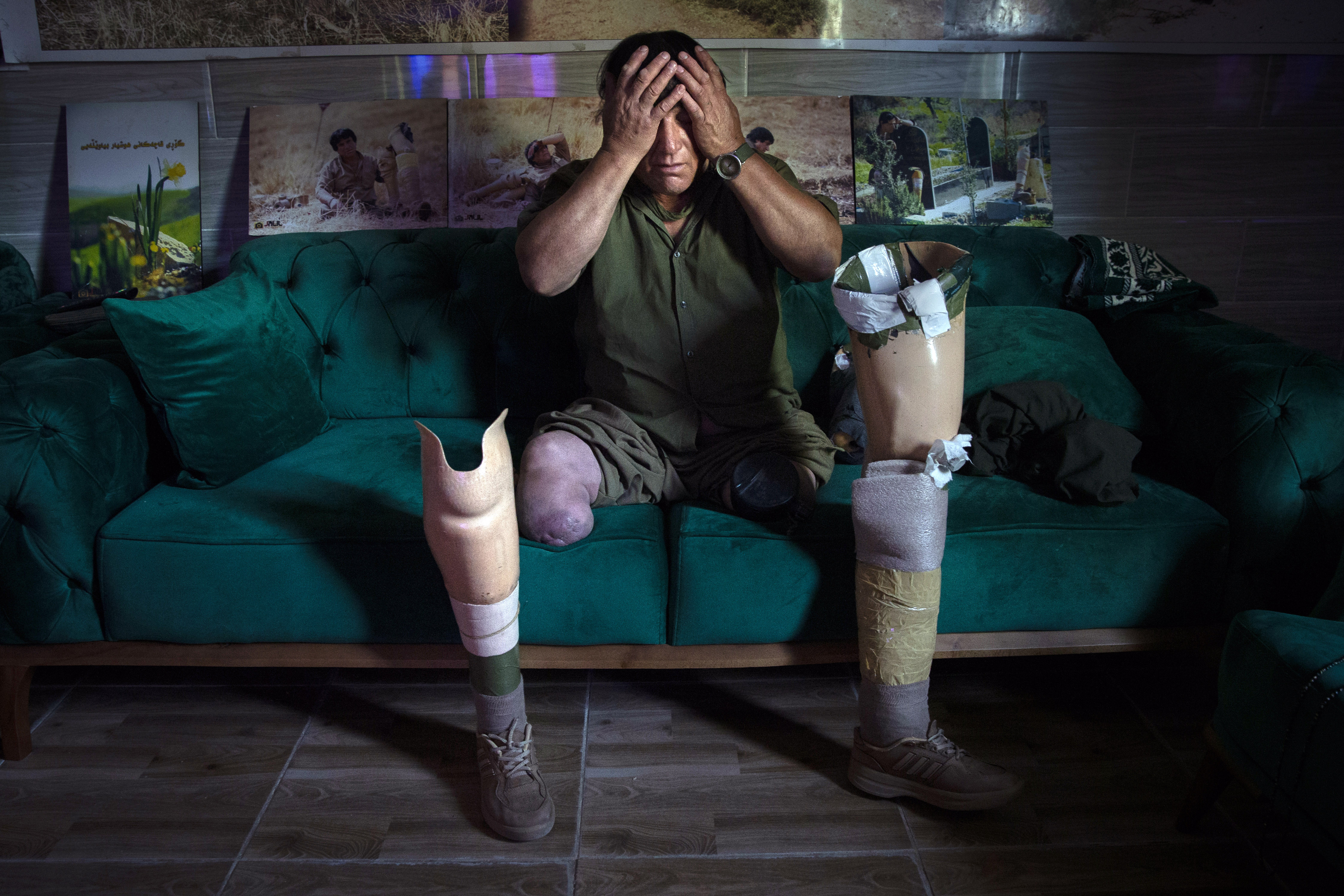 July 8, 2021, Halabja, Sulaymaniyah, Iraqi Kurdistan: Landmine deminer ALI HOSHYAR BYAWELAIY hands to his head as he tries to rests on his couch at his home near Halabja. Byawelaiy, after long day. Ali, has cleared at least 2,500,000 explosives, has lost both of his legs, two brothers, two cousins and another brother lost his eye due to landmine incidents. (Credit Image: © Daniel Carde/ZUMA Press Wire)