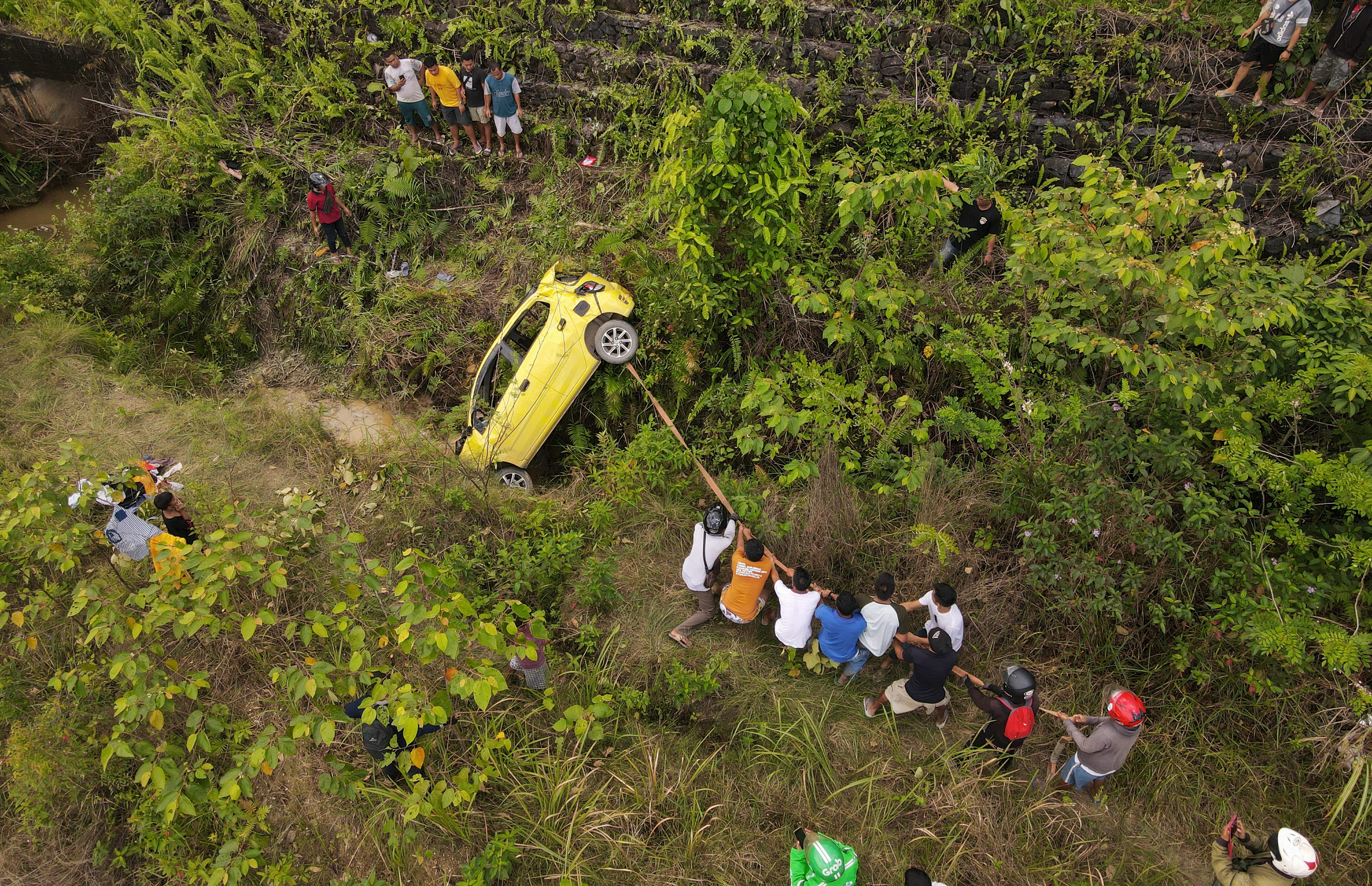 September 11, 2021, Kendari, South East Sulawesi, Indonesia: Residents are trying to evacuate a vehicle that crashed down the ravine however no one sustained injuries. The accident is suspected to have been caused by a sleepy driver. (Credit Image: © Andry Denisah/SOPA Images via ZUMA Press Wire)