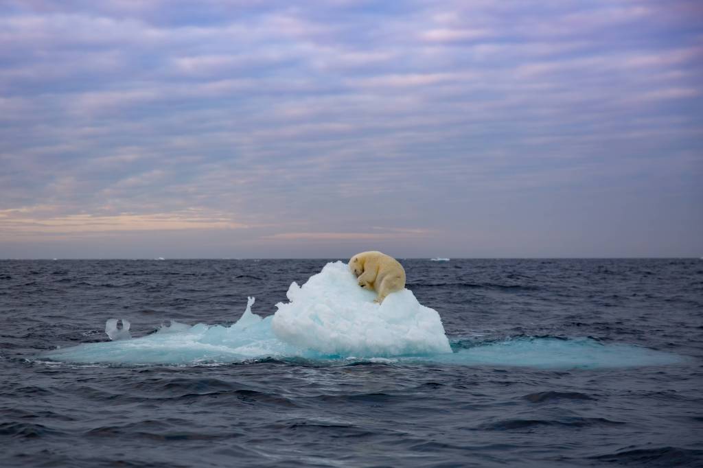 October 12, 2021, Svalbard, Norway: Polar bear on a tiny floating chunk of ice drifting on the Barents Sea, off the shoreline of Norway. Drifting out to sea on his baby iceberg, the adorable 800 pound young male polar bear seemed sleepy or maybe lost. (Credit Image: © Irene Arniet/Media Drum World via ZUMA Press)