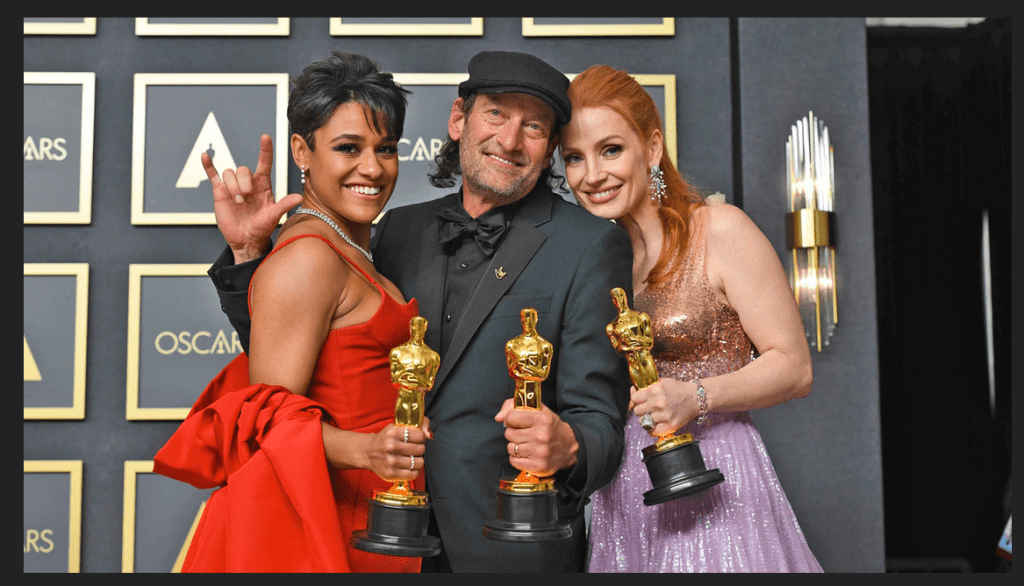 March 27, 2022, Los Angeles, California, USA: ARIANA DEBOSE, TROY KOTSAR AND JESSICA CHASTAIN in the Press Room during the 94th Academy Awards, presented by the Academy of Motion Picture Arts and Sciences (AMPAS), at the Dolby Theatre in Hollywood. (Credit Image: © Kevin Sullivan via ZUMA Press Wire)