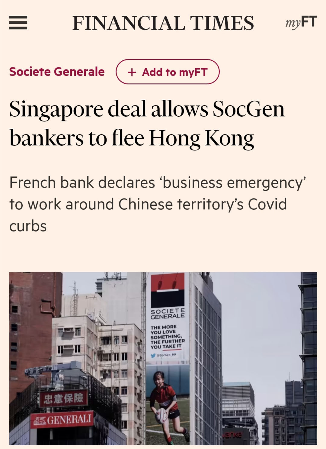 August 6, 2020, Hong Kong, CHINA: View of outdoor advertisement of French major bank, SOCIETE GENERALE displayed on the building’s wall in the commercial centre in CENTRAL, Hong Kong.Aug-6,2020 Hong Kong.ZUMA/Liau Chung-ren (Credit Image: © Liau Chung-ren/ZUMA Wire)