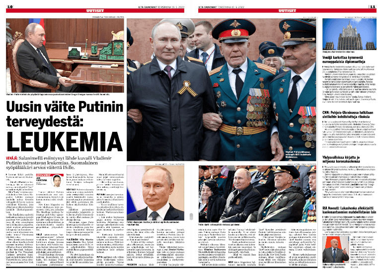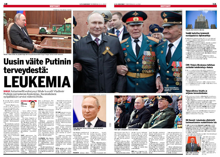Bottom center, page 11: May 9, 2022, Moscow, Russia: Russian President VLADIMIR PUTIN sits in the review stand with veterans at the start of the 77th annual Victory Day military parade celebrating the end of World War II at Red Square in Moscow, Russia. (Credit Image: © Mikhail Metzel/Kremlin Pool/Planet Pix via ZUMA Press Wire)