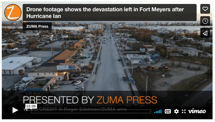 Drone footage shows the devastation left in Fort Meyers after Hurricane Ian Posted by ZUMAPRESS.com on October 14, 2022 Posted in: ZUMALAND. Leave a comment Video Credit © Roger Edelman/ZUMA Press The deaths of more than 100 people in Florida have been attributed to Hurricane Ian. It slammed into the Fort Myers area of Southwest Florida on Sept. 28 as a Category 4 hurricane with 150-mph winds. Share this: Share on Facebook (Opens in new window) Facebook Share on LinkedIn (Opens in new window) LinkedIn Share on X (Opens in new window) X Like Loading... Related Posts navigation ← ZUMA’s Juan Carlos Hernandez Venezuelan Migrant Image Featured in Multiple Sources ZUMA IMAGE REQUEST →