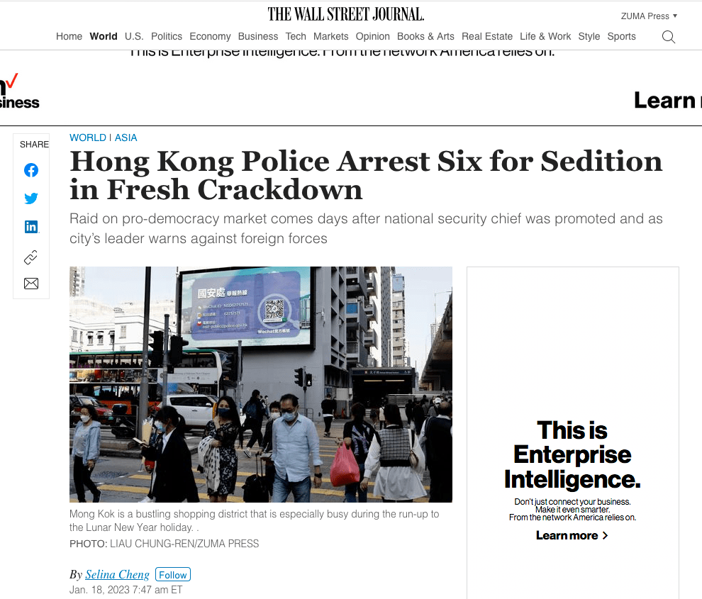 December 9, 2022, HONG KONG, CHINA: A large advertisement of ‘ Reporting Hotline ‘ by HONG KONG NATIONAL SECURITY BUREAU is being projected on the screen outside Mong Kok Police Station where fierce and persistent armed conflict occurred during 2019 Civil Unrest in Hong Kong. Citizens are encouraged to report any ‘ suspicious activities ‘ which are regarded as a threat to the so called ‘ national security ‘, making Hong Kong, similar to one of many cities on China Mainland being watched under strict police surveillance.Dec-9,2022Hong Kong.ZUMA/Liau Chung-ren (Credit Image: © Liau Chung-ren/ZUMA Press Wire)