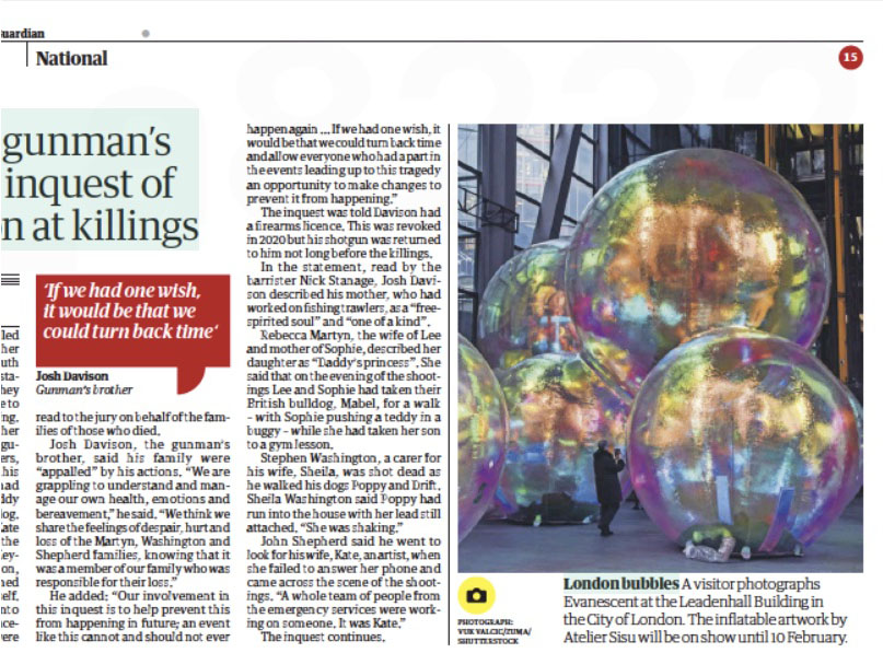 January 17, 2023, London, England, United Kingdom: A visitor takes photos of the giant iridescent bubbles, an art installation entitled ‘Evanescent’ from design studio Atelier Sisu, outside Leadenhall Building in the City of London, the capital’s financial district. (Credit Image: © Vuk Valcic/ZUMA Press Wire)