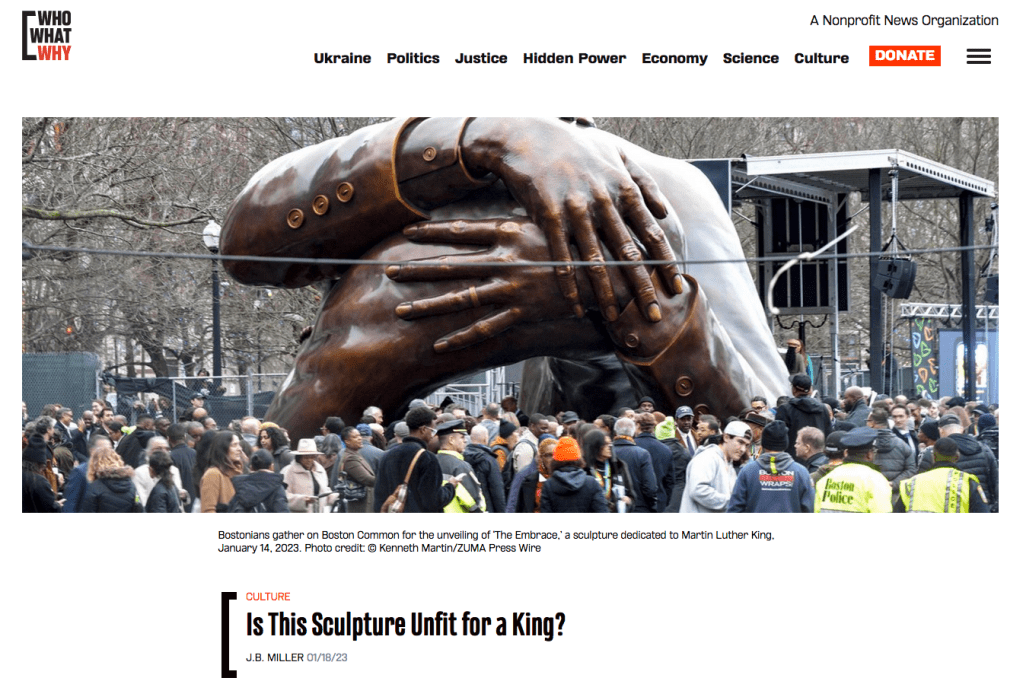 January 14, 2023, Boston, Massachusetts, U.S: Bostonians gather on Boston Common for the unveiling of The Embrace, a sculpture dedicated to Martin Luther King. The King family was in attendance as was Governor Healy and Mayor Wu, making speeches and inter-acting with the invitees. Many Bostonians had to lift tarps covering the view that had been installed on chainlink fences to have a peek at the ceremonies and the statue poking camera lenses through the holes in the fence. (Credit Image: © Kenneth Martin/ZUMA Press Wire)