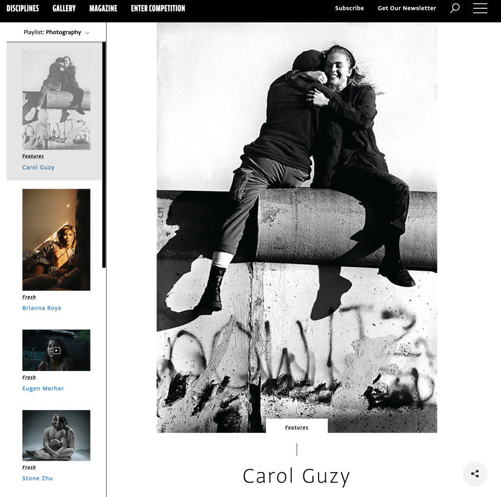 ZUMA’s Carol Guzy Interviewed for Commarts.com Posted by ZUMAPRESS.com on March 29, 2023 Posted in: ZUMALAND. Leave a comment ZUMA photographer Carol Guzy reflects on her life, work and relationships in an article with commarts.com. Scott Mc Kiernan, Founder & Editor-in-Chief, ZUMA Press Share this: Share on Facebook (Opens in new window) Facebook Share on LinkedIn (Opens in new window) LinkedIn Share on X (Opens in new window) X Like Loading... Related Posts navigation ← Scott Mc Kiernan Presents zReportage: Behind Putins Curtain: Inside Russia Today by ZUMA Photographer Celestino Arce Lavin Sit back and enjoy POM! “The Pictures of the Month” presented by Scott Mc Kiernan and ZUMA Press. ZUMA received a enormous volume of over one million top professional photographer’s images, all shot in the month of March →