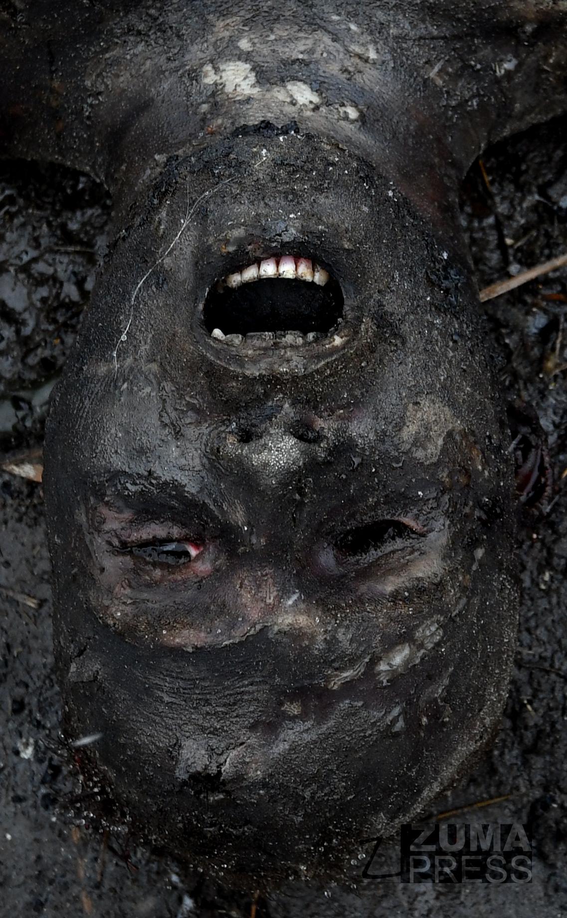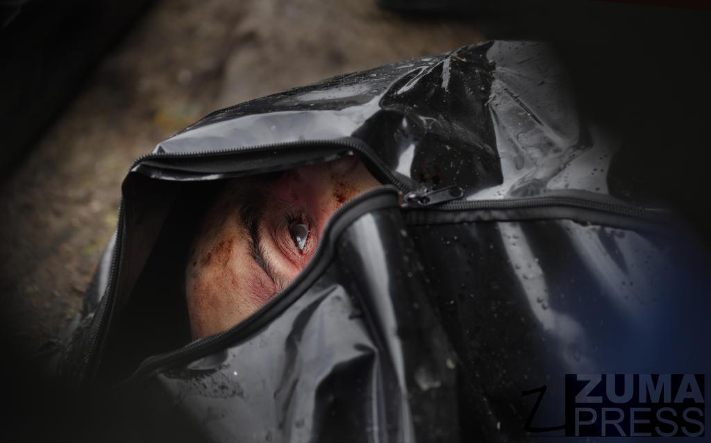 . - April 6, 2022, Bucha, Kyiv Oblast, Ukraine: An eye open on a dead man in a body bag. As investigators and volunteers begin grim work of chronicling civilian deaths and assessing evidence of war crimes in Bucha. Wreckage of war and bodies lie in the streets of Bucha, recently liberated from invading Russian troops in the suburbs of Kyiv where atrocities have been reported. Over 320 bodies have been recovered. (Credit Image: © Carol Guzy/ZUMA Press Wire)