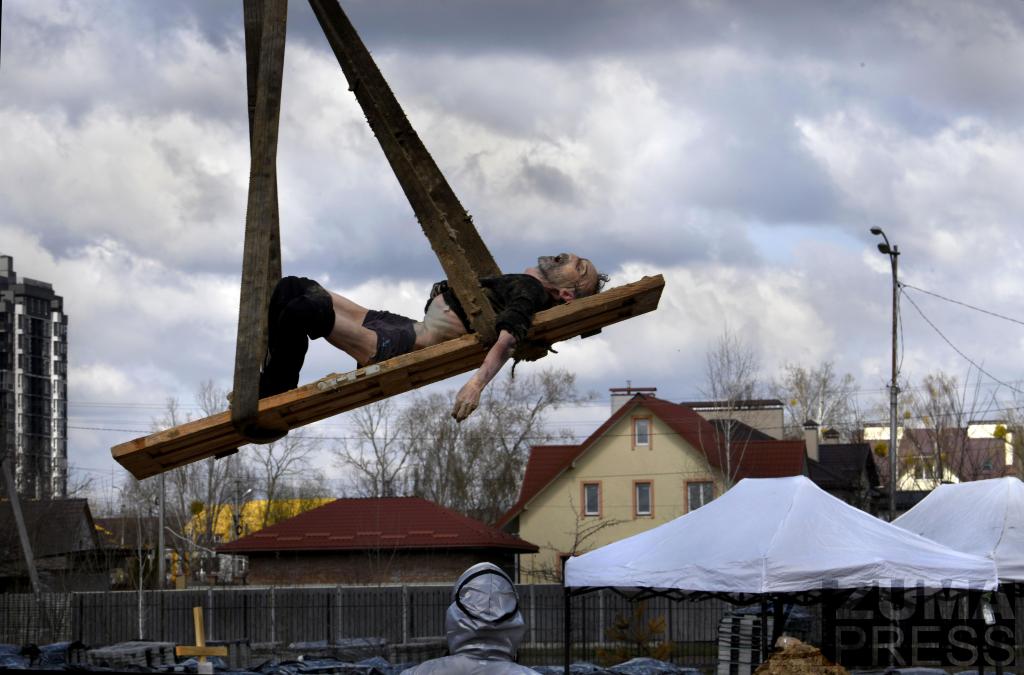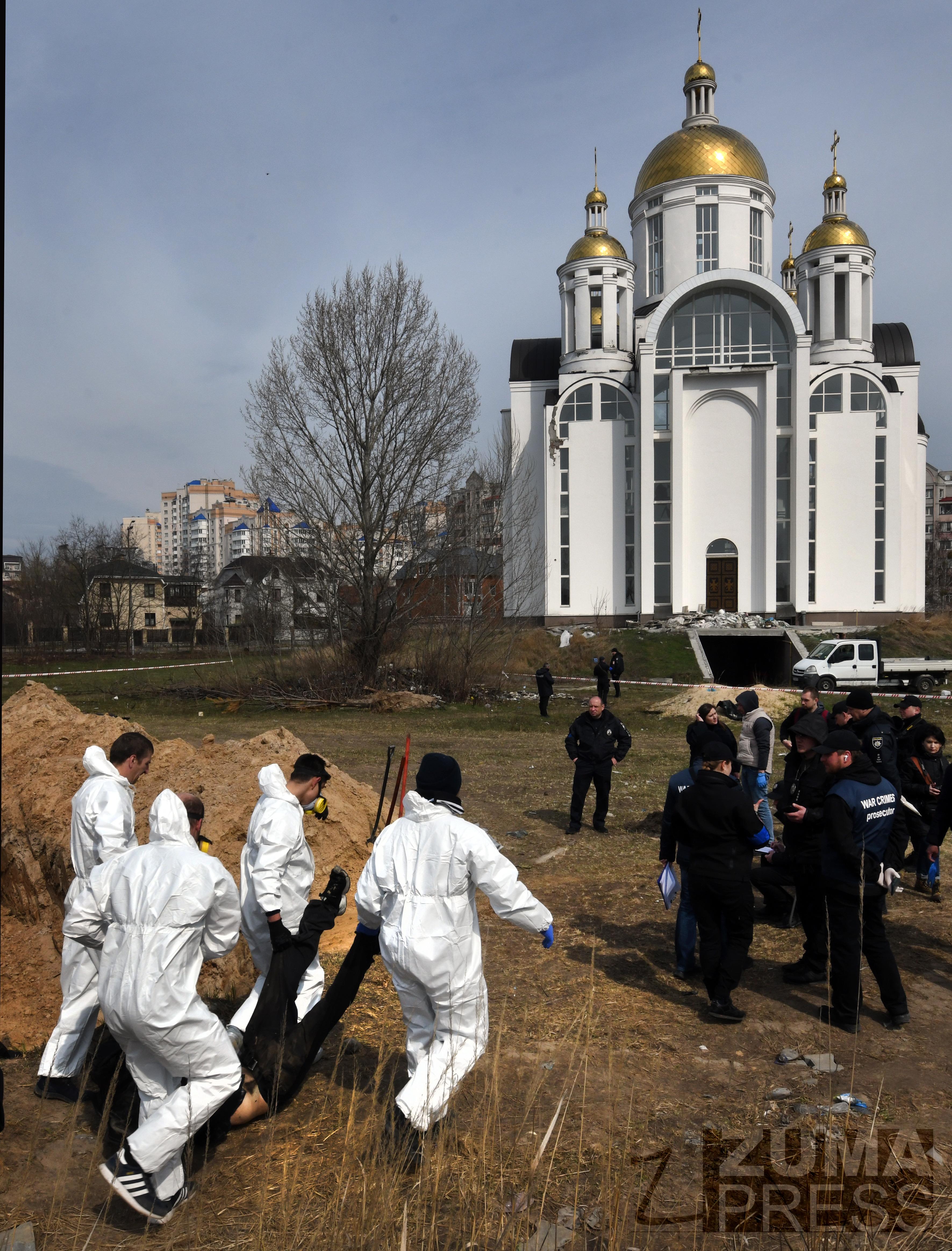 . - April 11, 2022, Bucha, Kyiv Oblast, Ukraine: Investigators begin the grim task of pulling bodies from a mass grave behind the Church of St. Andrew and All Saints, while assessing evidence of war crimes in Bucha. Wreckage of war and bodies littered the streets of Bucha, recently liberated from invading Russian troops in the suburbs of Kyiv where atrocities have been reported. (Credit Image: © Carol Guzy/ZUMA Press Wire)