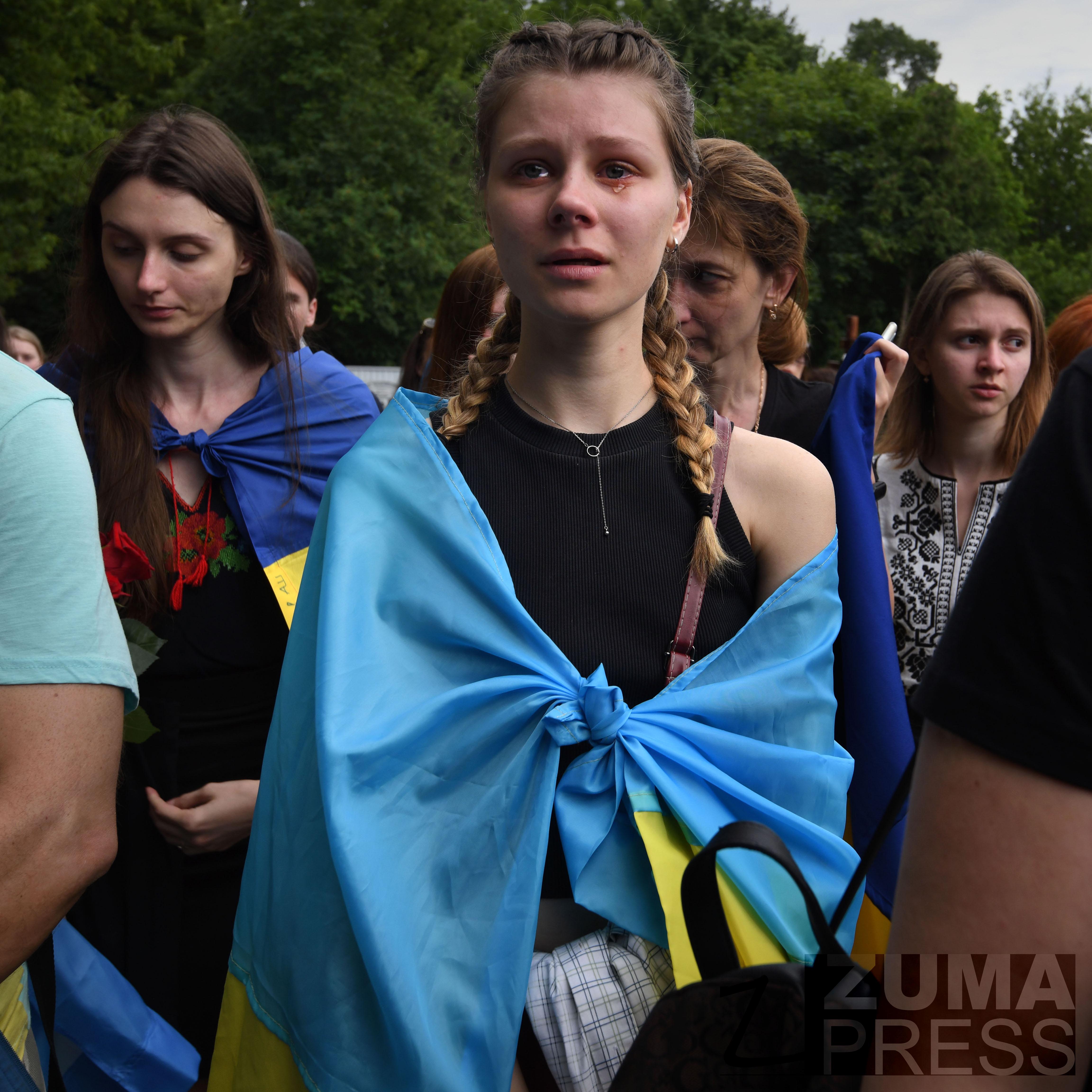- June 18, 2022, Kyiv, Ukraine: A young women, cries at the Baikove Cemetery funeral ceremony for activist and soldier Roman Ratushnyi, 24, who was killed while fighting in the Kharkiv region during the Russian invasion, Saturday. Ratushnyi has become a symbol of revolution and mourners came wrapped in the Ukrainian flag, leaving flowers and sorrow at his gravesite. (Credit Image: © Carol Guzy/ZUMA Press Wire)