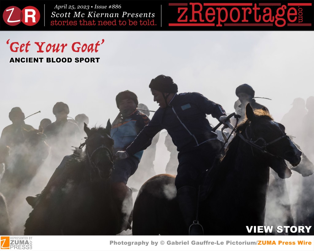 The sport of kokpar is like blood soaked polo match, with a headless goat carcass as the ball. Kokpar is one of the oldest nomadic games in Kazakhstan and is said to have originated with Genghis Khan’s early-13th-century mounted raiders. Matches would typically consist of 50 or 100 men and boys on horseback coming together in a clash of sweat and blood, with shouting riders and rearing horses. Many Western critics are shell shocked by the idea of using a disemboweled goat in sport yet the game is still played this way across central Asia, but in recent years it has become increasingly professionalized, with salaries for players and televised matches. Welcome to ‘Get Your Goat: Ancient Blood Sport’