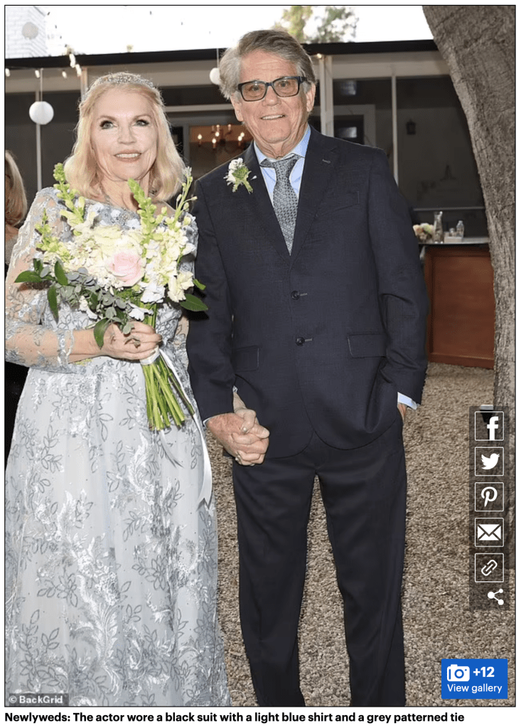 May 6, 2023, Ojai, California, USA: EXCLUSIVE! Newlyweds Former Happy Days star ‘Potsie’ aka ANSON WILLIAMS, 73, and SHARON MAHARRY, 64 after ceremony. The actor, who filed for divorce from his wife of 30 years in 2019, wore a black suit with a light blue shirt and a gray patterned tie. He had a boutonniere on the lapel of his jacket and wore black eyeglasses. The bride, who is a real estate agent in Ojai, California, wore a gorgeous, long-sleeved floor length white lace gown with a boat neck and full skirt. She wore her blonde hair pinned back off her face and carried a pretty bouquet of roses and hydrangeas. (Credit Image: © Nina Prommer/ZUMA Press Wire)