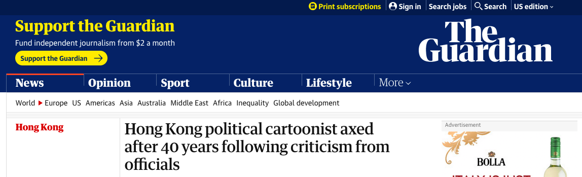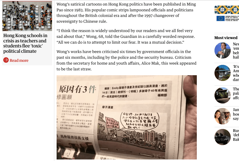 May 11, 2023, HONG KONG, CHINA: In Hong Kong, a reader holds today’s published edition of Ming Pao Daily News featuring political cartoonist ZUNZI’s art work and a note from the editor thanking him for his long years of service to the Paper. Hong Kong prominent political cartoonist pen named : ZUNZI ( Original name : Wong Kei-kwan ) has been terminated from MING PAO DAILY NEWS, Zunzi will be publishing his last art work this coming Sunday. Under increasing political pressure by HKSAR and pro-Chinese Communist henchmen and lawmakers, Hong Kong prominent political cartoonist ZUNZI who served city’s major paper Ming Pao Daily News and APPLE DAILY once managed by media tycoon and strong advocate for democracy, Jimmy Lai,now serving his time in jail without a trial, has been terminated by Ming Pao Daily News. The sucking of ZUNZI has aroused serious concern among the press in Hong Kong fearing strengthening political purge aimed against Hong Kong journalists and artists will further curtail freedom of press and freedom of expression in Hong Kong.May-11,2023Hong Kong.ZUMA/Liau Chung-ren (Credit Image: © Liau Chung-ren/ZUMA Press Wire)