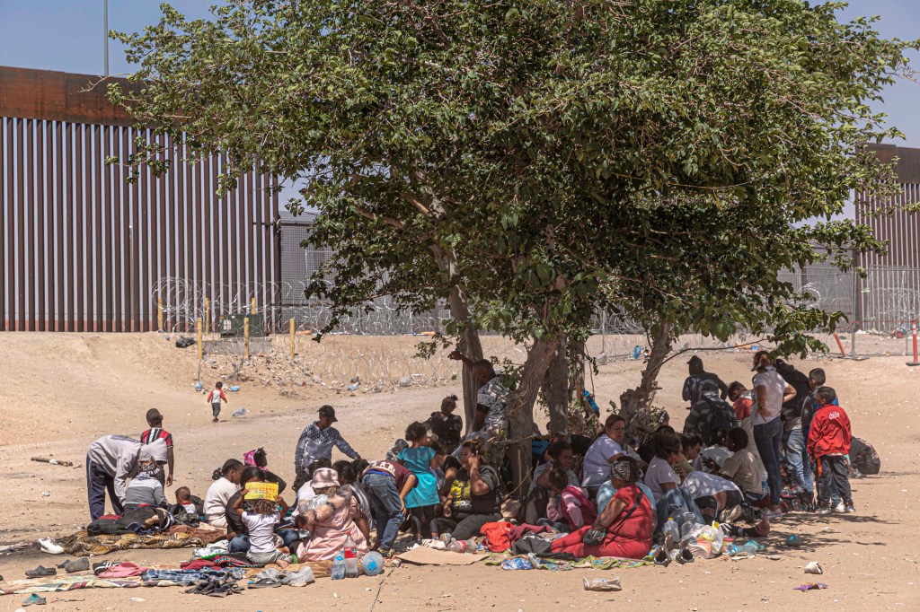May 10, 2023, Juarez-El Paso Border, Texas, USA: Migrants wait to be processed at gate 40 of the border wall after having crossed the Rio Grande from Ciudad Juarez in hopes of turning themselves in with the intention of seeking asylum. Many migrants waited without shelter for lengthy periods of time. After six days outside, under extreme heat during the day, freezing temperatures at night and fierce sandstorms, women and small children crowded together under the shade of two trees. ESMERALDA TOC, who fled violence from terrorists in San José del Guaviare, Colombia, worried about the fate of the children in the group who were getting sicker, with fever that continue to spike. With their medicine gone, the mothers tried everything they could, but the children were not responding, she said. Desperate, Tocó said she went to the US authorities and asked for medicine but she was rejected.