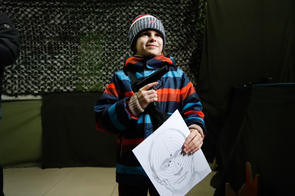 March 12, 2022, Lviv, Ukraine: A Ukrainian kid holding a pneumatic pistol and a paper target with the face of Russian President Vladimir Putin, at a gun gallery in Lviv, amid ongoing Russian invasion. Russian attacks on Ukraine have continued, with multiple bombings, tank attacks and killing of civilians reported in several cities since the beginning of the war. (Credit Image: © Daniel Ceng Shou-Yi/ZUMA Press Wire)