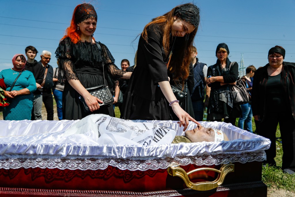 May 13, 2022, Dnipro, Dnipro, Ukraine: 14 year old Alexandria touches her father, who was a Ukrainian soldier and was killed in Kharkiv on May 3 during the fight against Russian soldiers on the east, for the last time during the funeral service, amid the Russian invasion of Ukraine. Father of Alexandria was found dead on 8 May, a day before the Russian Victory Day. Thousands of ukranian soldiers and thousands of civilians have been reported killed following the Russian invasion. (Credit Image: © Daniel Ceng Shou-Yi/ZUMA Press Wire)