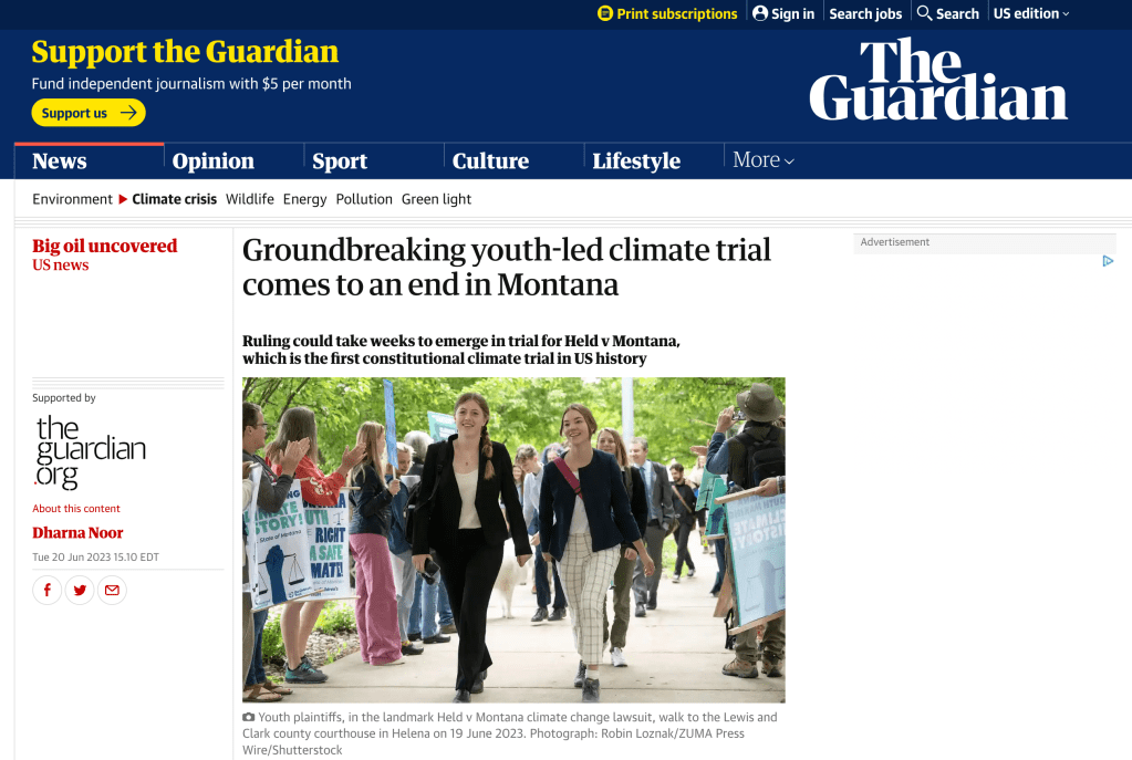 June 19, 2023, Helena, Montana, USA: Youth plaintiff RIKKI HELD, 22, middle, waits with other plaintiffs and attorneys for the start of trial in the landmark Held vs Montana climate change lawsuit in the Lewis and Clark County Courthouse in Helena on the sixth day of their trial. Sixteen young people argue that the state is robbing their future by embracing policies that contribute to climate change during the first of its kind constitutional lawsuit in the United States. The trial is scheduled to conclude with closing arguments on Wednesday. (Credit Image: © Robin Loznak/ZUMA Press Wire)