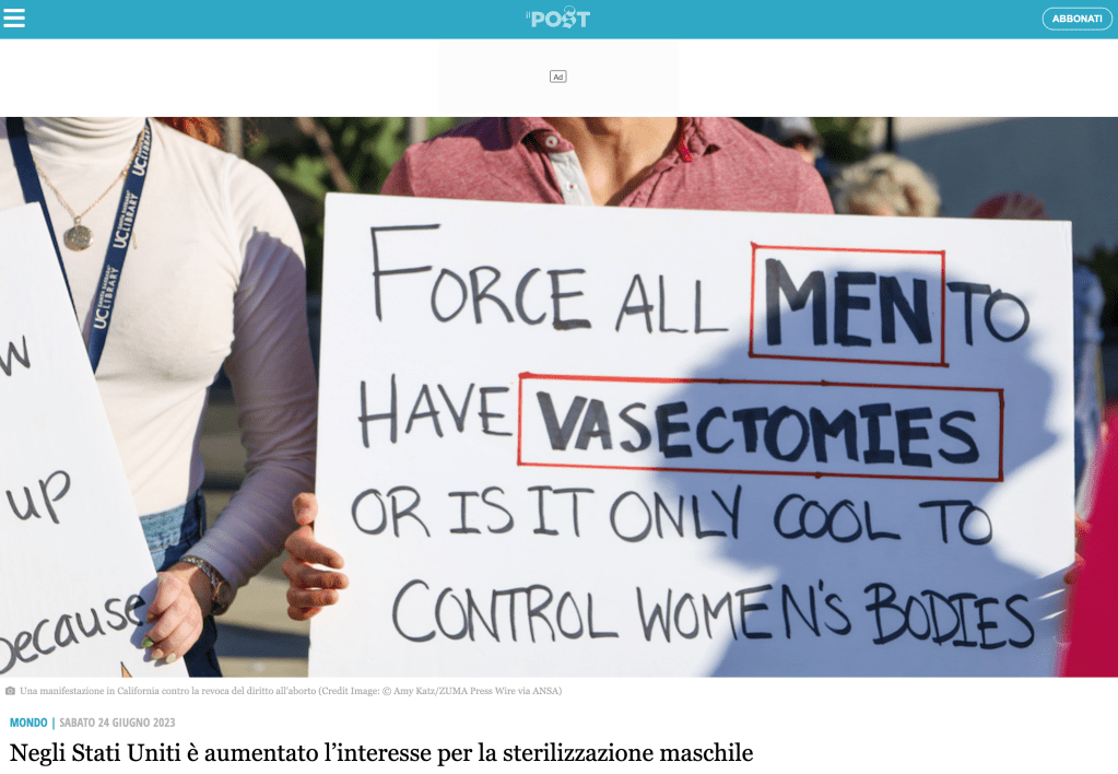 June 24, 2022, Santa Barbara, California, U.S: A male protestor holds a sign that reads, Force all Men to have vasectomies or is it only cool to control women’s bodies?. Hundreds of people turned out on short notice for a protest sponsored by Planned Parenthood at Santa Barbara historic CourtHouse on June 24, 2022, on the Day the Supreme Court overturned landmark Roe V. Wade decision which has protected women and abortion rights in the USA for fifty years. (Credit Image: © Amy Katz/ZUMA Press Wire)