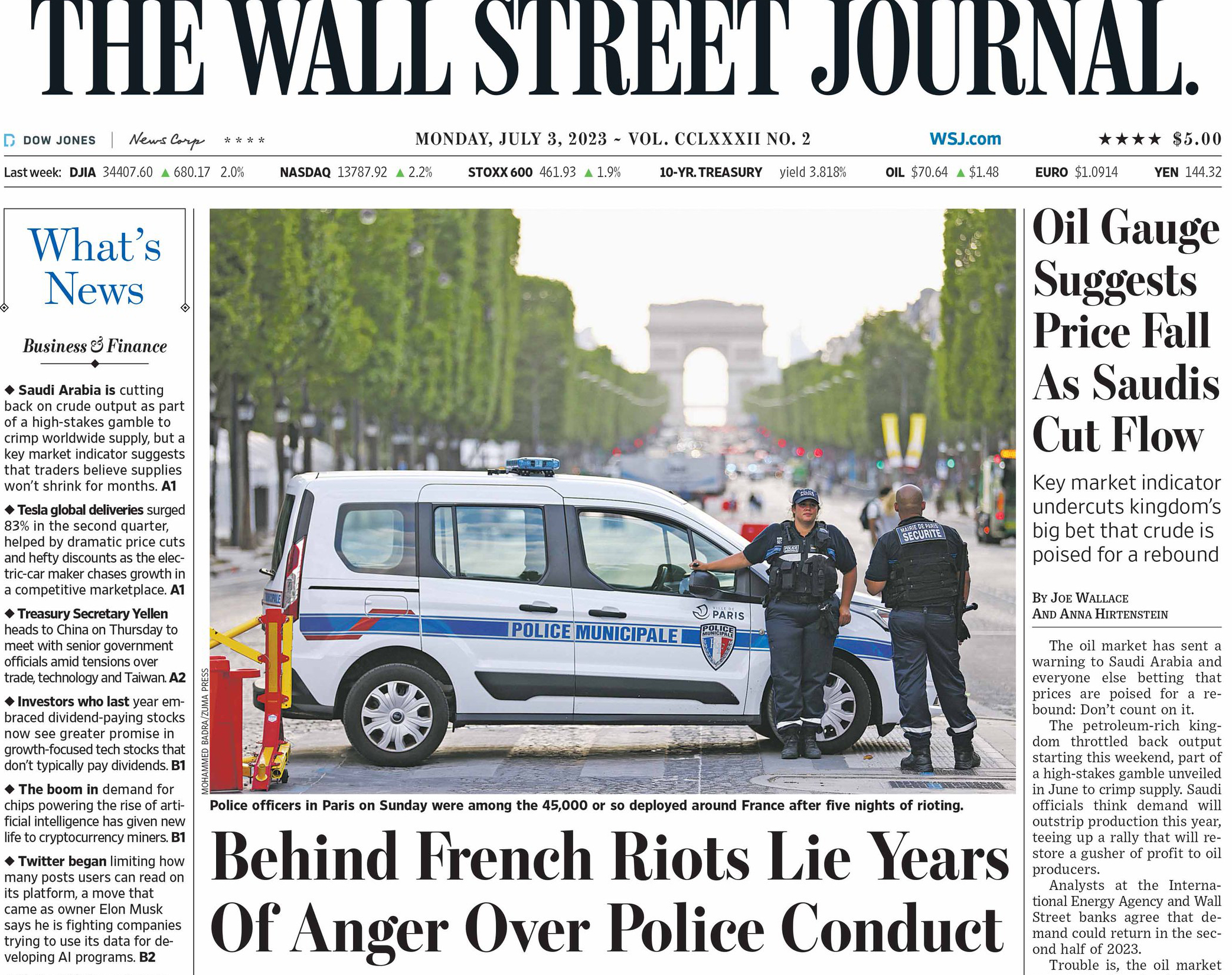 July 3, 2023: The Wall Street journal Newspaper Cover A1. Image by Mohammed Badra/EFE. Police officers stand guard near the Arc de Triomphe, after five consecutive nights of riots across the country following the death of Nahel, who was killed by French Police, in Paris. (Credit Image: © Wall Street Journal/ZUMA Press Wire)