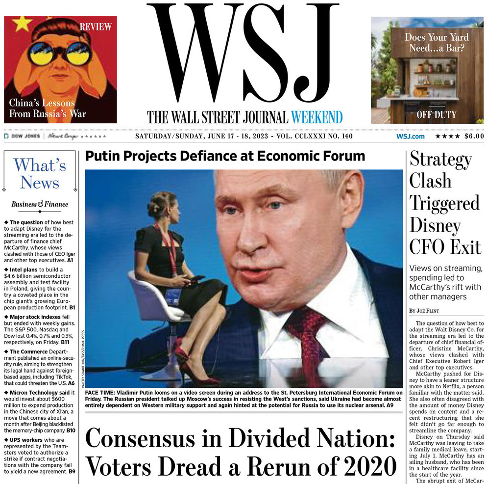 June 17, 2023: The Wall Street journal Newspaper Cover A1. Image by Valery Sharifulin/TASS. Russia’s President Vladimir Putin (on screen) addresses a plenary session of the 2023 St Petersburg International Economic Forum at the ExpoForum Convention and Exhibition Centre. (Credit Image: © Wall Street Journal/ZUMA Press Wire)