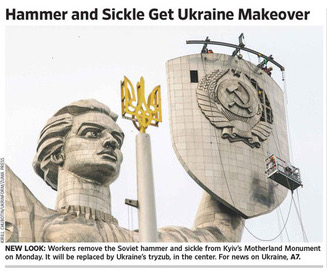 August 1, 2023: The Wall Street Journal Newspaper Cover A1. Image by Kirill Chubotin/Ukrinform shows A flagpole crowned by the coat of arms of Ukraine is seen as workers take down the State Emblem of the Soviet Union from the shield of the Motherland Monument, Kyiv on July 31, 2023. (Credit Image: © Wall Street Journal/ZUMA Press Wire)