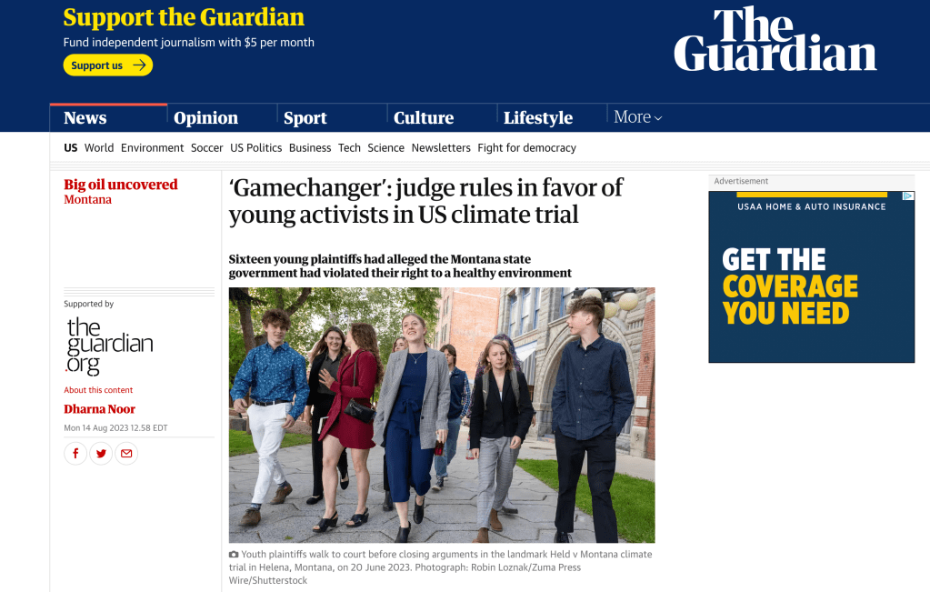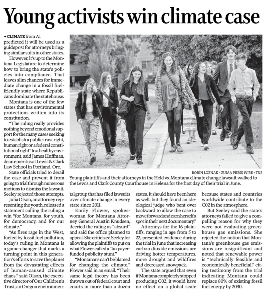 August 14, 2023: Game-Changer: Climate Kids Win! They win today the Held vs Montana climate change lawsuit, In Helena, Montana the judge who heard the United States’ first constitutional climate trial earlier this year ruled in favor of a group of young plaintiffs who had accused state officials in Montana of violating their right to a healthy and clean environment. As reported in The Guardian, Eva, a plaintiff who was 14 when the suit was filed said, ”I’m so speechless right now. I’m really just excited and elated and thrilled.” The lawyers described the first-of-its-kind ruling as a ”game-changer” and a ”sweeping win”. The case was brought by the non-profit Our Children’s Trust legal team based in Eugene, Oregon. The firm has similar outstanding youth-led constitutional climate change cases pending in numerous state courts. The team is also litigating the ground breaking Juliana v United States federal climate change lawsuit moving its way through the federal court system. FILE PHOTO TAKEN ON: June 12, 2023, Helena, Montana, USA: Youth plaintiffs and their attorneys in the the landmark Held vs Montana climate change lawsuit walk to the Lewis and Clark County Courthouse in Helena for the first day of their trial. Sixteen young people are suing the state of Montana over their constitution right to a safe and clean environment. It’s the first case of its kind to reach trial in the United States. (Credit Image: © Robin Loznak/ZUMA Press Wire)