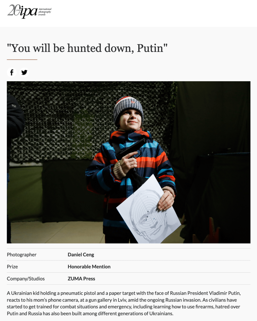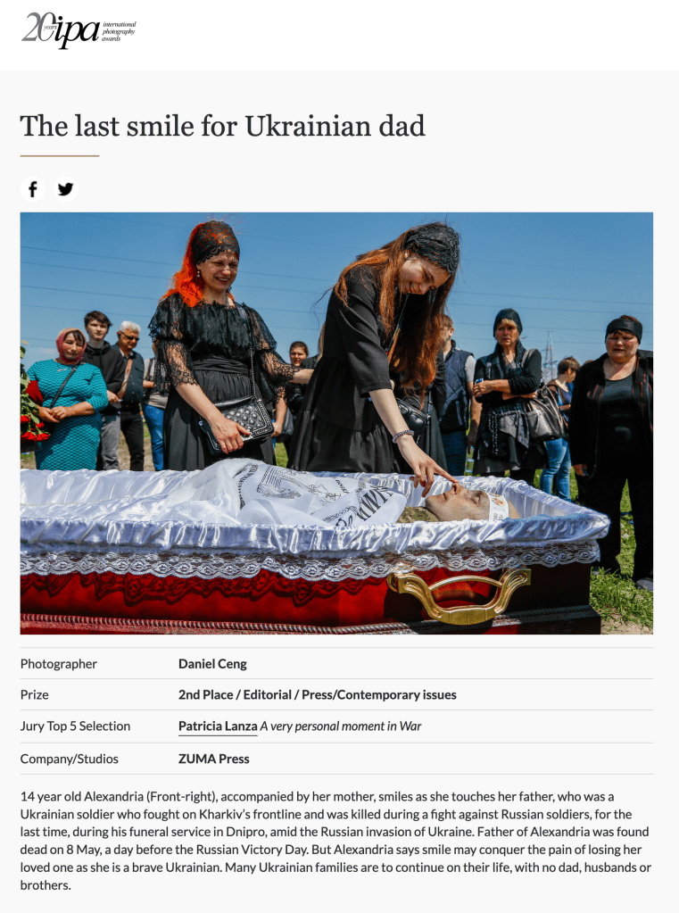 Big congrats to ZUMA’s Daniel Ceng and his award winning work documenting the war in Ukraine. Ceng earned 2nd place/Editorial/Press/Contemporary issues; 3rd Place / Editorial / Press/War / Conflict; and an honorable mention in the International Photography Awards 2023 contest. Click through below to view his incredible work!
