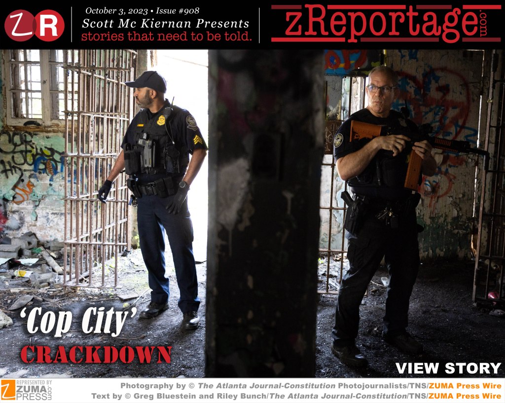 Scott Mc Kiernan presents zReportage.com Issue #908 Story of the Week: Published TUESDAY, October 3, 2023: ‘Cop City’ Crackdown Pictures by ZUMA Press partner Newspaper Atlanta Journal-Constitution photographers Riley Bunch, Miguel Martinez, Hyosub Shin, Steve Schaefer, John Spink, Arvin Temkar: Activists from the ”Stop Cop City” movement are fighting against the construction of a new police training facility in Atlanta. The roughly three year long battle that has included violent protests, the police killing of a climate activist, numerous arrests, and sweeping domestic terrorism and racketeering charges against protesters that have alarmed civil rights advocates. The city argues the facility will be important to properly train police and replace worn out facilities. Protesters claim it will empower police violence, in part through creating a mock city to practice urban warfare tactics. Welcome to ‘Cop City’ Crackdown