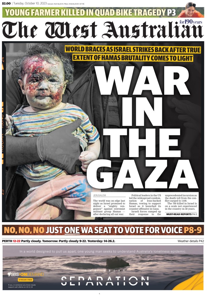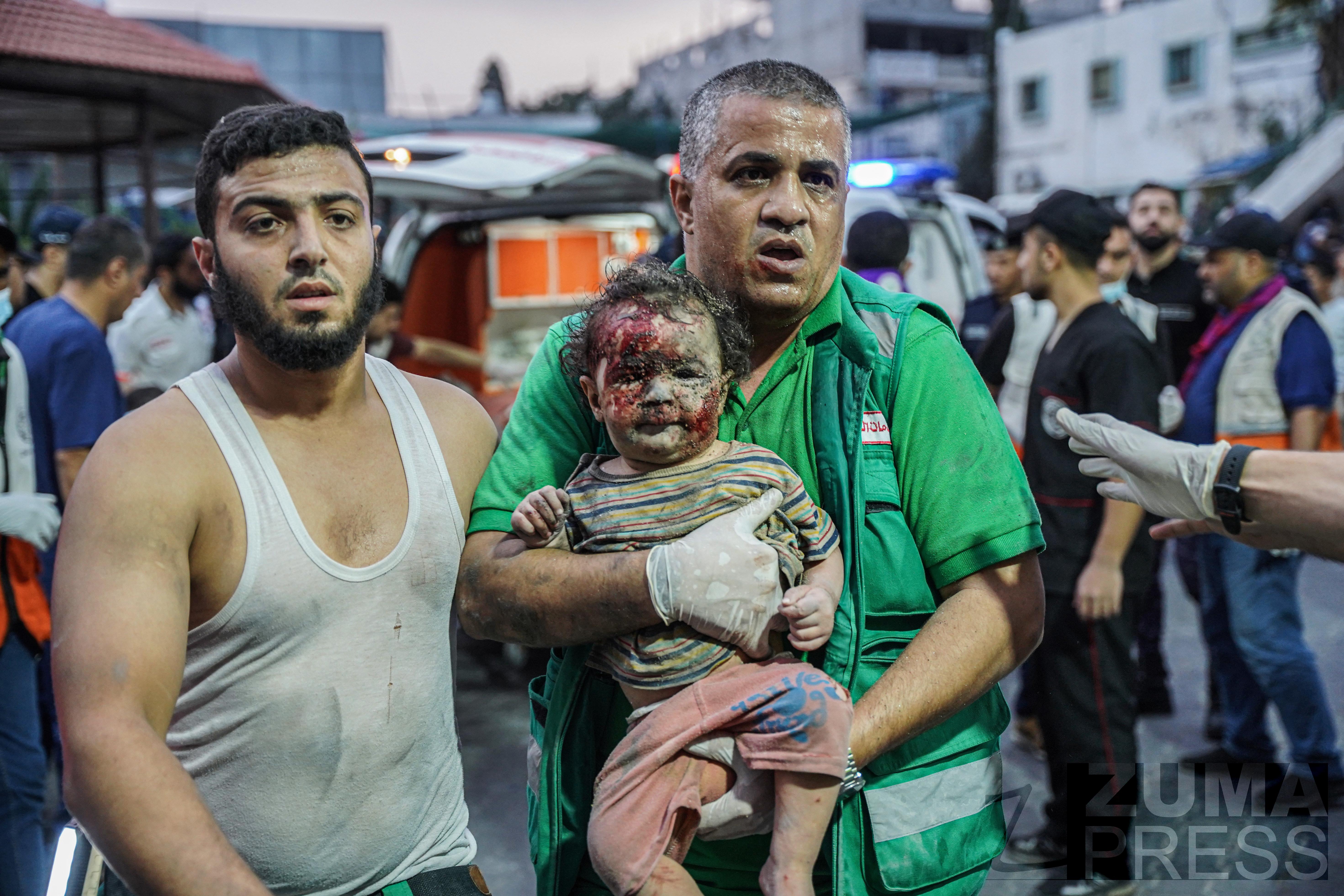 October 9, 2023, Gaza, Gaza, Palestine: A paramedic holds a little girl with her face full of blood and dirt from the effects of the bombing of Israeli planes (Credit Image: © Saher Alghorra/ZUMA Press Wire)