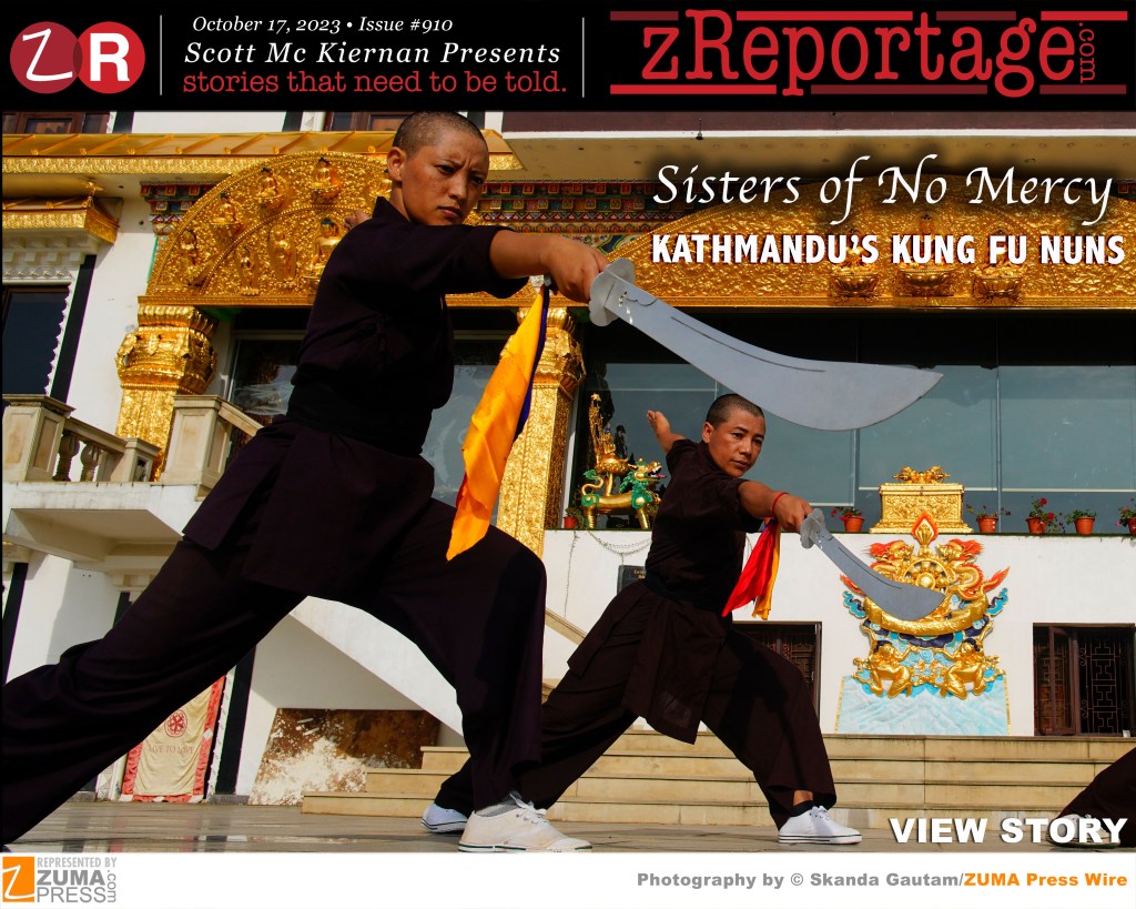Scott Mc Kiernan presents zReportage.com Issue #910 Story of the Week: Published TUESDAY, October 17, 2023: ‘Sisters of No Mercy: Kathmandu’s Kung Fu Nuns’ Pictures by award winning ZUMA Press photographer Skanda Gautam: Legend has it that 1,000 years ago in the Himalayas, Buddhist Gyalwang Drukpa saw nine dragons fly into the sky. He was so inspired that he decided to create and train a new order of nuns, one committed to peace, nature, gender equality and, most recently, kung fu. The 350 women of the Drukpa dragon order are highly skilled in martial arts, in which they train with swords, machetes and nunchucks six days a week. The nuns focus on their spiritual roots by championing gender equality, physical fitness, environmentally-friendly ways of living, and respect for all living beings. They also help the sick, rescue animals, pick up litter and can rewire a temple. Welcome to ‘Sisters of No Mercy: Kathmandu’s Kung Fu Nuns’.