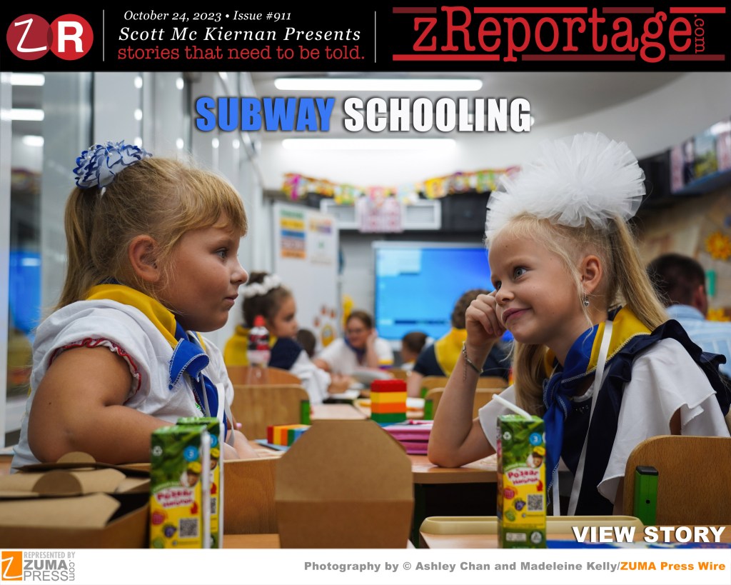 Scott Mc Kiernan presents zReportage.com Issue #911 Story of the Week: Published TUESDAY, October 24, 2023: ‘Subway Schooling’ Pictures by award winning ZUMA Press photographers Ashley Chan and Madeleine Kelly: In Ukraine’s eastern city of Kharkiv, where the threat of Russian missile attack is ever-present, local authorities have implemented a novel way to get kids back into school in safety. Covid then the invasion meant Kharkiv could offer little in-person education. Now a scheme brings it deep underground. In a bright decorated classroom in Kharkiv, only 19 miles from the Russian border, children attend classes in one of the city’s Soviet-era metro stations. A bus brings the children to the Station where teachers lead them underground to begin their second school year during wartime. The U.N. Children’s Fund stated that Russian air attacks have destroyed 1,300 schools since President Vladimir Putin began his full-scale invasion of Ukraine in February 2022 and many more damaged. Welcome to ‘Subway Schooling’
