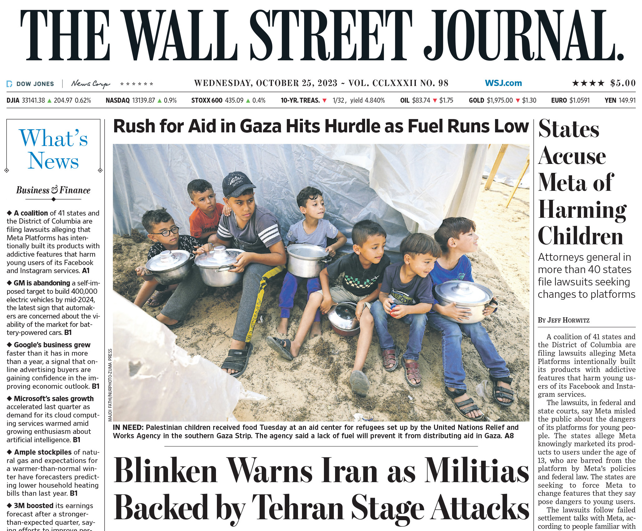 October 25, 2023: The Wall Street Journal Newspaper Cover, A1. Image by Majdi Fathi/NurPhoto/ZUMA Press Wire shows Palestinian children receive food at an aid center set up by United Nations Relief and Works Agency for Palestine Refugees (UNRWA) in Khan Yunis in the southern Gaza Strip on October 24, 2023 in Gaza, Palestine. (Credit Image: Wall Street Journal/ZUMA Press Wire)