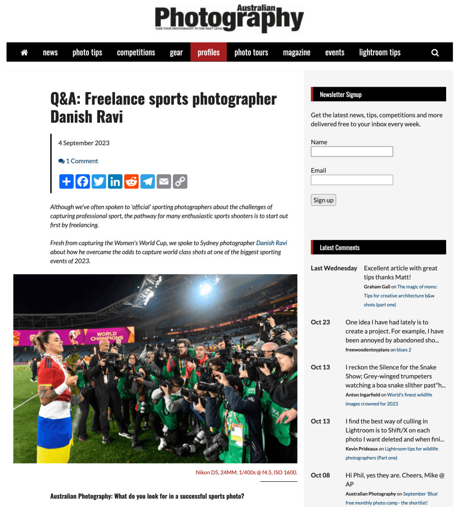 Q&A with ZUMA Photograher Danish Ravi in Australian Photography Posted by ZUMAPRESS.com on October 30, 2023 Posted in: ZUMALAND. Leave a comment Scott Mc Kiernan, Founder & Editor-in-Chief, ZUMA Press Share this: Share on Facebook (Opens in new window) Facebook Share on LinkedIn (Opens in new window) LinkedIn Share on X (Opens in new window) X Like Loading... Related Posts navigation ← ZUMA’s Mickael Chavet Featured in Both Print and Online L’Equipe NEW Zreportage: Maine Manhunt →