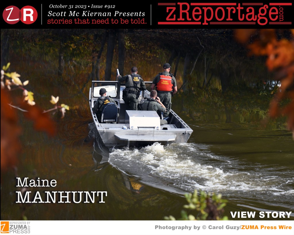 Scott Mc Kiernan presents zReportage.com Issue #912 Story of the Week: Published TUESDAY, October 31, 2023: ‘Maine MANHUNT’ Pictures by 4 time Pulitzer Prize winning ZUMA Press photographer Carol Guzy: The U.S. has had at least 565 mass shootings so far this year, according to the Gun Violence Archive. This averages out to almost two mass shootings a day. Mass shootings are defined as an incident in which four or more victims are shot or killed. Following the deadliest mass shooting in Maine’s history and 2 day manhunt, the suspected gunman, Robert Card, was found dead in a trailer at a recycling center in Lisbon Falls after an apparent suicide. The gunman had opened fire at a bowling alley in Lewiston, killing 18. Two counties were under a ‘shelter-in-place order for 48 hrs while the gunman was at-large. Maine has a strong hunting tradition and high rates of gun ownership. It has also long had one of the lowest murder rates in the country. However the state has few gun safety laws, and does not require background checks on gun sales. According to Everytown, a gun violence research center, 89% of all gun deaths in Maine are cases of suicide. The Lewiston gun-mans motives remain unknown. The U.S. is currently on pace to experience 700 mass shootings in 2023. Welcome to: ‘Maine MANHUNT’