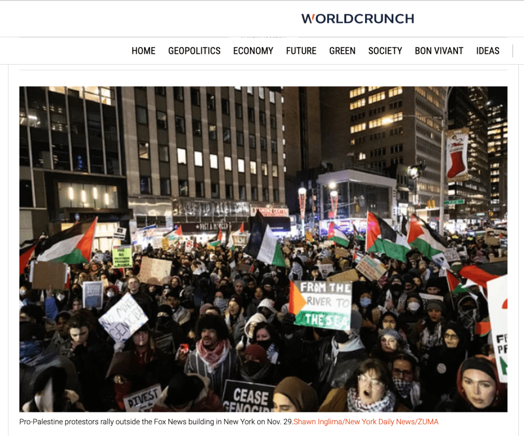 November 29, 2023, Manhattan, New York, United States: Pro-Palestine protestors rally outside the Fox News building on Sixth Avenue during the Rockefeller Tree Lighting ceremony in Manhattan on Wednesday, Nov. 29, 2023, in New York City. (Credit Image: © Shawn Inglima/New York Daily News via ZUMA Press Wire)