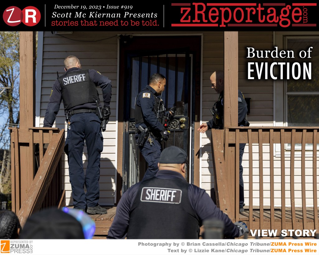 Scott Mc Kiernan presents zReportage.com Issue #919 Story of the Week: Published TUESDAY, December 19, 2023: ‘Burden of EVICTION’ Pictures by ZUMA Press represented Chicago Tribune’s photographer Brian Cassella and story by staff writer Lizzie Kane: Eviction rates in The US are soaring after the pandemic’s renter protection programs expired, with rising rents and a shortage of affordable housing leaving many Americans scrambling to cover costs, find a new place to live or face homelessness. Each year, 2.9 million children under 18 are threatened with eviction, while 1.5 million are evicted. This puts low-income Americans at major risk of losing out on housing. Evictions are on the rise in Chicago, shedding light on the city’s affordable housing crisis and rising rental rates. Through Dec. 5 of this year, 6,600 people were evicted in Cook County, the Chicago Tribune reports. Welcome to ‘Burden of EVICTION’