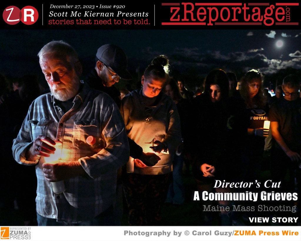 Scott Mc Kiernan presents zReportage.com Issue #920 Story of the Week: Published TUESDAY, December 26, 2023: ‘Maine Mass Shooting A COMMUNITY GRIEVES’ Pictures by 4 time Pulitzer Prize winning ZUMA Press photographer Carol Guzy: Following the deadliest mass shooting in Maine’s history the suspected gunman, Robert Card, was found dead in Lisbon Falls after an apparent suicide. The gunman had opened fire at Schemengees Bar in Lewiston, killing 18. Joshua Seal, 36 an ASL interpreter was killed at the bar, which was hosting a cornhole tournament for members of the deaf community when the gunman entered. He leaves behind his wife Elizabeth Seal and four children. Arthur Strout was killed when least 18 people were gunned down in the assault in Lewiston. Strout’s father Arthur Barnard was playing pool with his son at the bar and left just before the gunman opened fire. He has turned his pain into purpose, attending the Center for American Progress national Gun Violence Prevention conference and a National vigil by the Newtown Action Alliance. Barnard is lobbying lawmakers in Congress for common sense gun control measures, especially a nationwide registry, and says ‘They should walk a day on our shoes.’ Welcome to: ‘Maine Mass Shooting A COMMUNITY GRIEVES’