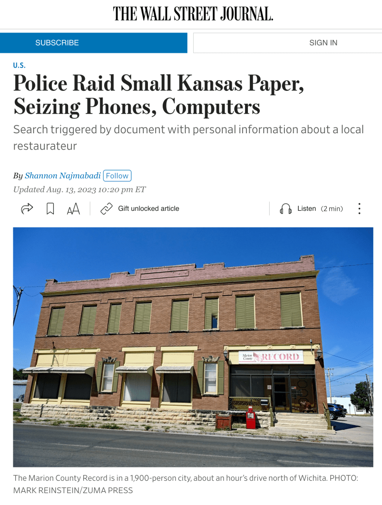 August 12, 2023, Marion, Kansas, USA: In an unprecedented raid Friday, local law enforcement seized computers, cellphones and reporting materials from the Marion County Record office, the newspaper’s reporters, and the publisher’s home. (Credit Image: © Mark Reinstein/ZUMA Press Wire)