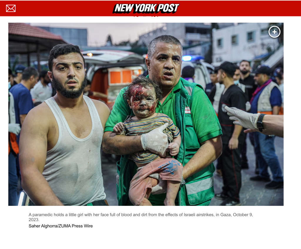 October 9, 2023, Gaza, Palestine: A paramedic holds a little girl with her face full of blood and dirt from the effects of the bombing of Israeli planes after Hamas attacked Israel on October 7, 2023. (Credit Image: © Saher Alghorra/ZUMA Press Wire)