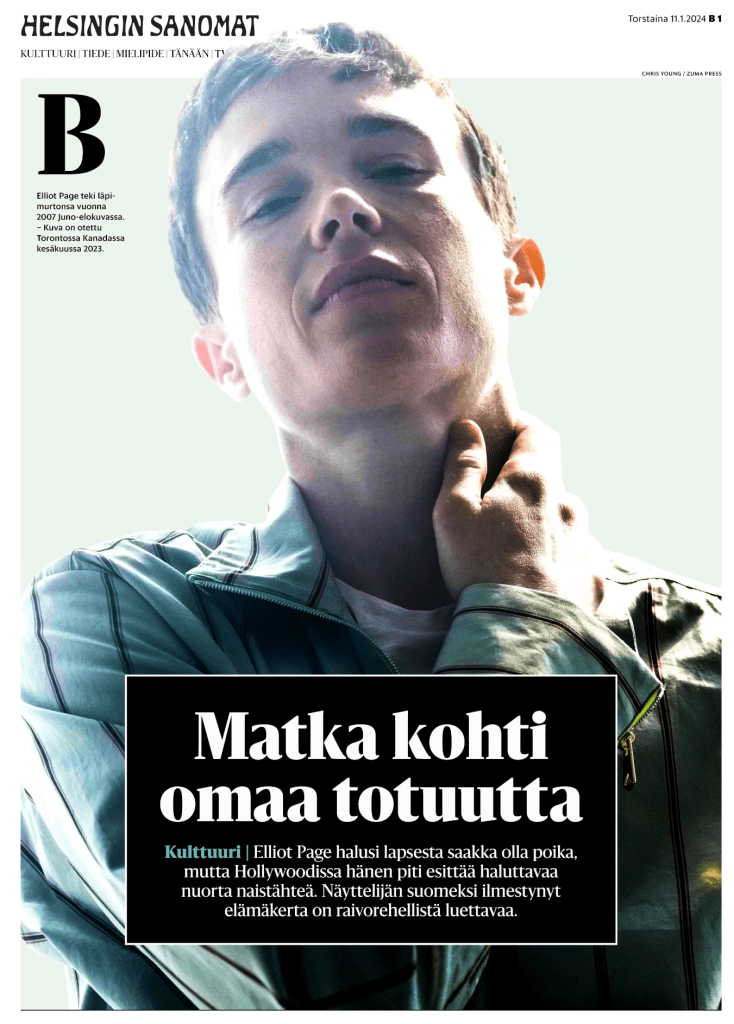 Full Page in Helsingin Sanomat for ZUMA Posted by ZUMAPRESS.com on January 11, 2024 Posted in: ZUMALAND. Leave a comment June 16, 2023, Toronto, ON, CAN: Elliot Page poses for a portrait in Toronto, Friday, June 16, 2023. (Credit Image: © Chris Young/The Canadian Press via ZUMA Press) Scott Mc Kiernan, Founder & Editor-in-Chief, ZUMA Press Share this: Share on Facebook (Opens in new window) Facebook Share on LinkedIn (Opens in new window) LinkedIn Share on X (Opens in new window) X Like Loading... Related Posts navigation ← ZUMA’s Tayfun Salci Prince Harry Image on Ilta-Sanomat ZUMA on Cover of Finnish Magazine Seura →
