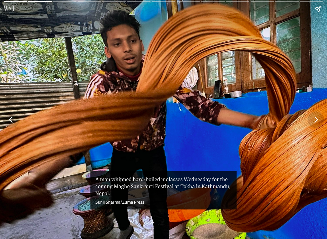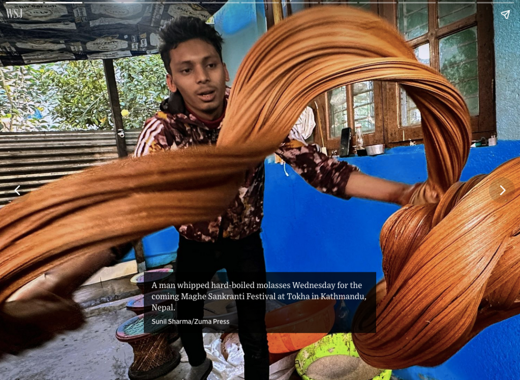 January 10, 2024, Kathmandu, Bagmati, Nepal: A man whips the hard-boiled molasses or ‘Chaaku’ for the upcoming Maghe Sankranti Festival at Tokha in Kathmandu. (Credit Image: © Sunil Sharma/ZUMA Press Wire)