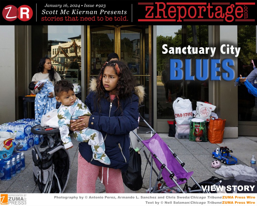 Scott Mc Kiernan Presents zReportage.com Issue #923 Story of the Week: Published TUESDAY, January 16, 2024: ‘Sanctuary City Blues’ Pictures by ZUMA Press represented Chicago Tribune’s photographer’s Antonio Perez, Armando L. Sanchez and Chris Sweda and Story By reporter Nell Salzman: When the governor of Texas started busing migrants elsewhere in 2023, the border crisis arrived in places like Chicago, which has to provide housing for the thousands of mostly Venezuelan migrants. Southern border states are sending migrants to Chicago and other immigration-friendly U.S. cities that have no clear plan to care for them. Police stations have become the most visible evidence of how the wave of asylum seekers arriving are stretching the ‘Windy City’ to the limit. Welcome to ‘Sanctuary City Blues’.