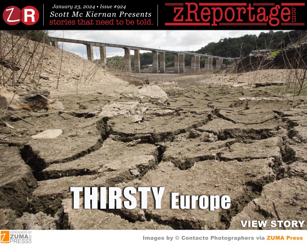 Scott Mc Kiernan Presents zReportage.com Issue #924 Story of the Week: Published TUESDAY January zReportage.com Issue #924 Story of the Week: Published TUESDAY January 23, 2024: ‘THIRSTY Europe’ by ZUMA Partner agency Contacto photo-journalist’s Carlos Castro, Cesar Ortiz, Fernando Sanchez, Fabian Simon, Lorena Sopana, Lex Zea, David Zorrakino: Europe is facing its worst drought in at least 500 years, with two-thirds of the continent in a state of alert or warning, reducing inland shipping, electricity production and the yields of certain crops. Catalonia is suffering with reservoirs that provide water for about 6 million people, including Spain’s second-biggest city Barcelona, filled to just 18 percent of their capacity an extreme and unprecedented low, even though nearly 45% of drinking water consumption depends on them. By comparison, Spain’s reservoirs as a whole are at 43 percent of their capacity. Spanish authorities and experts point to the impact of climate change in the increasingly hot and dry weather. Tighter water restrictions went into effect and Barcelona may need to have fresh water shipped in by boat in the coming months to ensure drinking water supplies for its 5.5 million inhabitants. Welcome to ‘THIRSTY Europe’